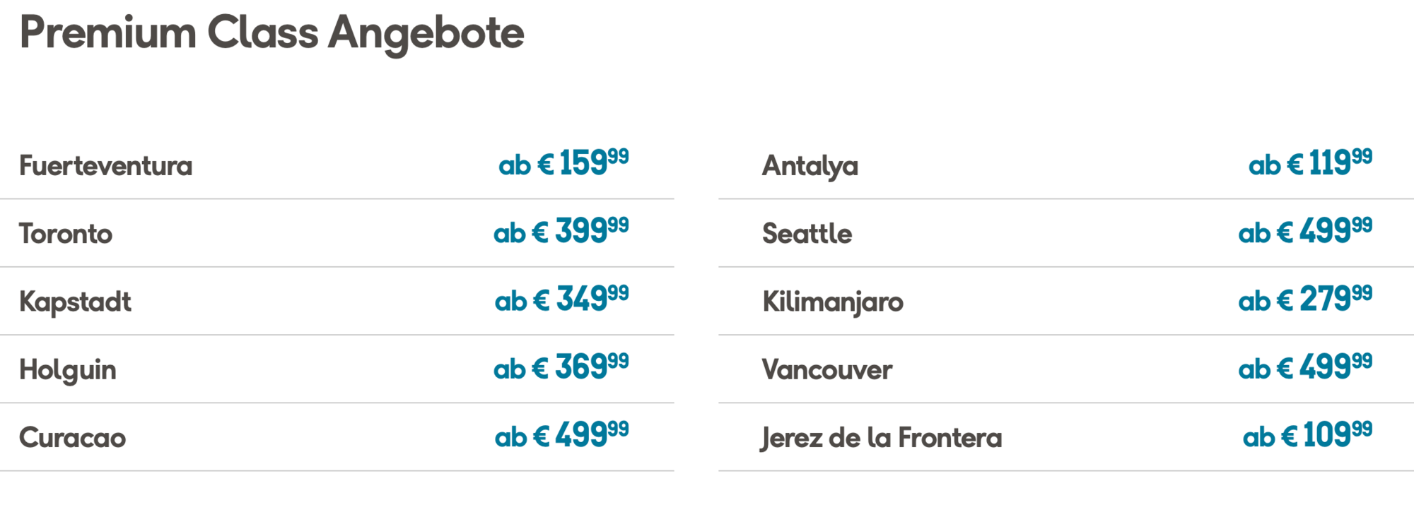 Condor Langfliegen und Kurzfliegen. D.h. günstige Flüge nach Europa, z.B. ans Mittelmeer, an den Atlantik (Portugal und Marokko), ans Rote Meer (Ägypten) oder auf die Kanaren. Dazu noch Langstreckenflüge nach Asien, Südafrika, Karibik oder Nordamerika. Im Angebot sind vor allem auch die höherwertigen Sitze in der Premium Economy Class. Klick hier:![]()